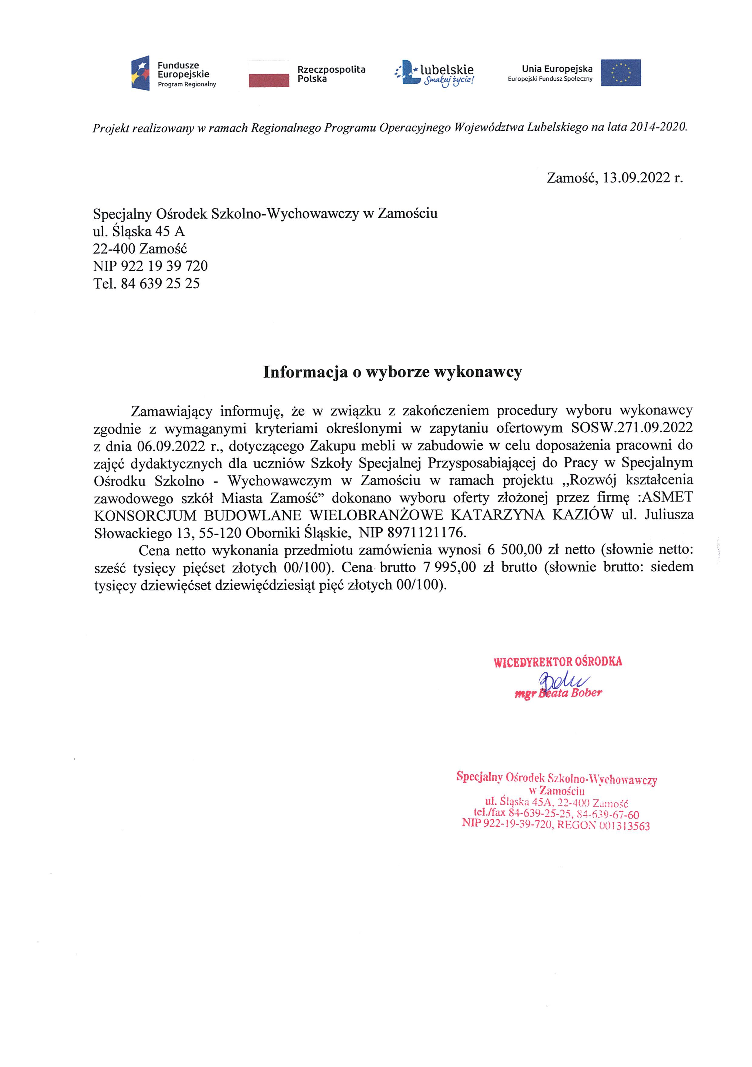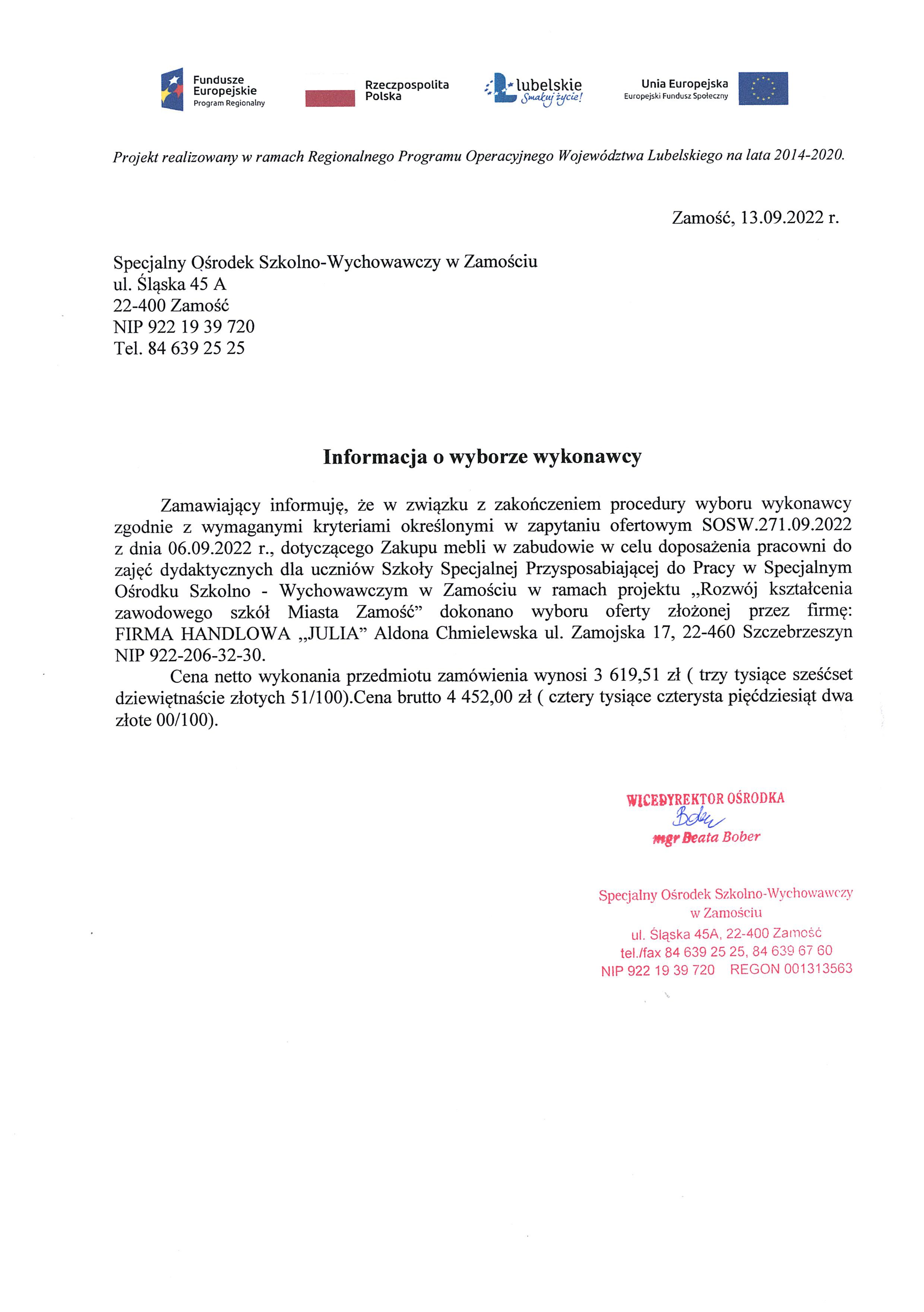 - Informacja o wynikach dotycząca zakupu mebli w zabudowie w celu doposażenia pracowni do zajęć dydaktycznych dla uczniów Szkoły Specjalnej Przysposabiającej do Pracy.